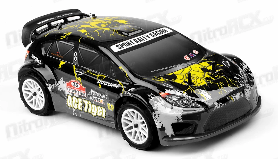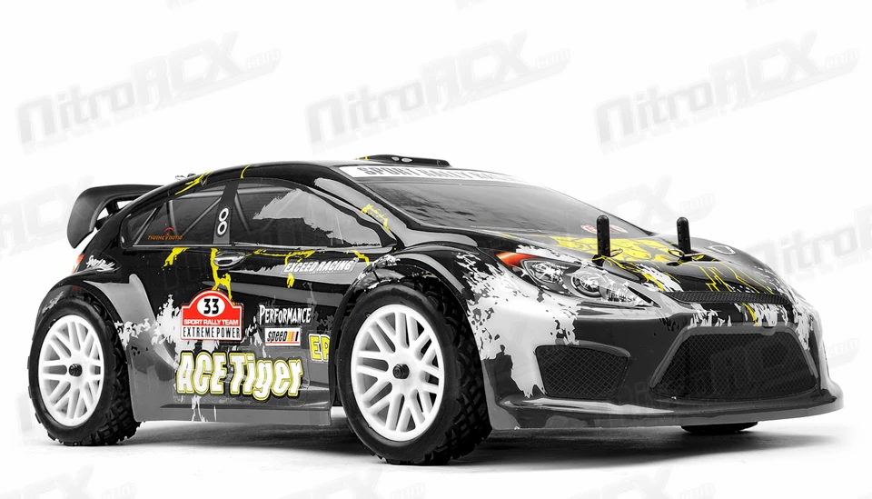 The AceTiger is a 1/10 scale rally car. It is designed from the ground up with pure rally performance in mind. Performance features derived from rally cars have been shrunken down in size and engineered to deliver the utmost performance in a 1/10 scale rally car package. A composite chassis serves as the base of this rally car. Mounted on the front and rear are aluminum shock towers towering over the metal geared differentials. Attached to the robust towers are oil filled shocks providing plush and ground hugging dampening. The steering tie rods and upper and lower arms are adjustable for fine tuning of the toe and camber, effectively altering the handling characteristics of the machine.Â