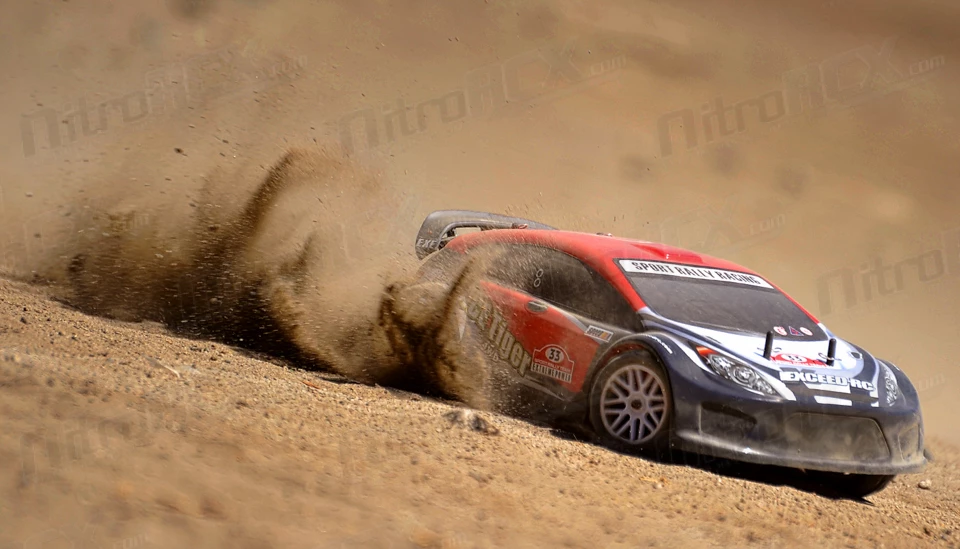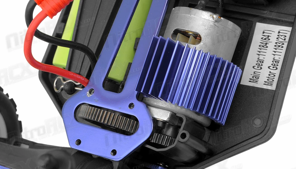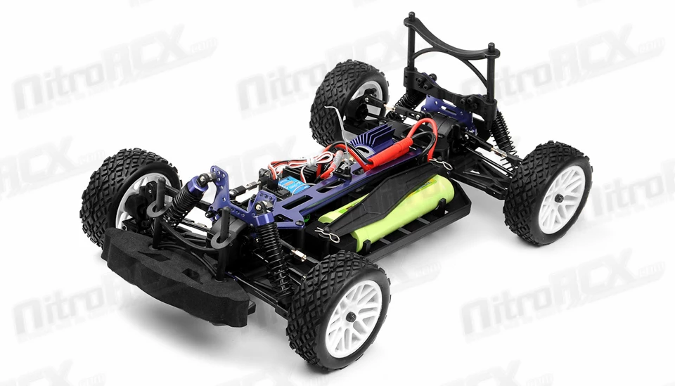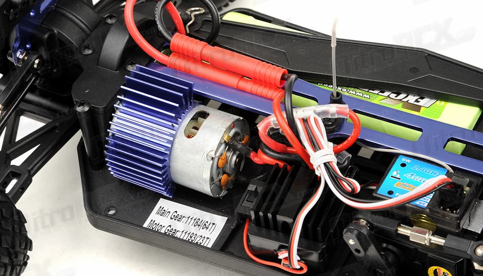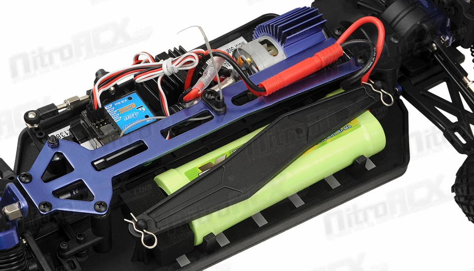 This car has awesome power to weight ratio. The vehicle is easily propelled by the 540 sized high performance brushed motor. A brushed electronic speed controller delivers the current efficiently through an included 7.2v 1800mah Ni-Mh battery and charger. The brushed electronic speed controller is lipo ready and can accept 7.4v lipo batteries with a quick switch of a jumper switch. All of this power transfers through a shaft driven four wheel drive system providing ground clawing action through the performance wheels and rally spec tires. We recommend a Gens Ace 7.4v 3300mah lithium battery for an exponential increase in power and efficiency.