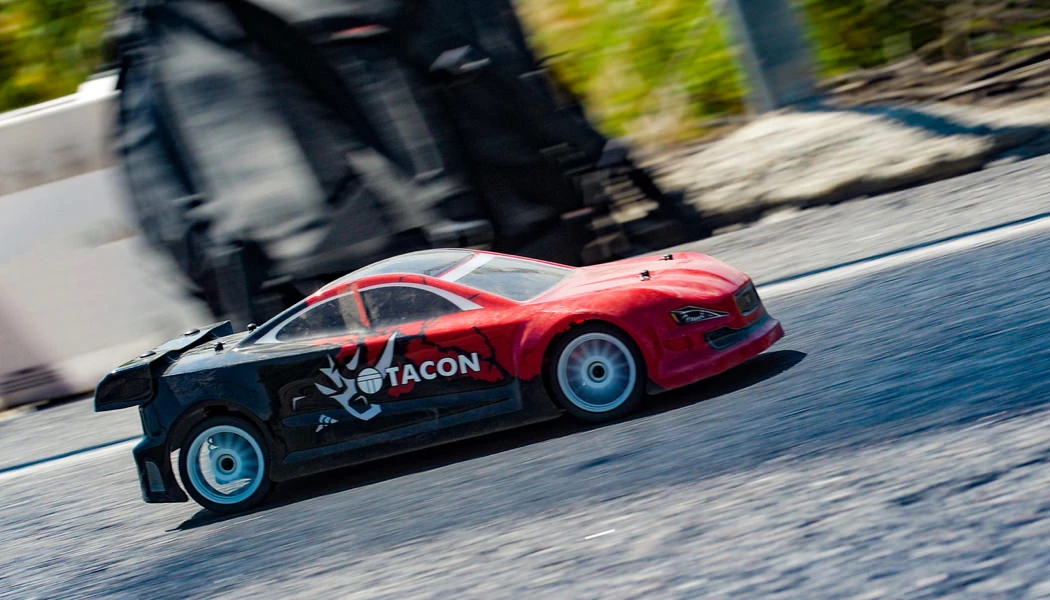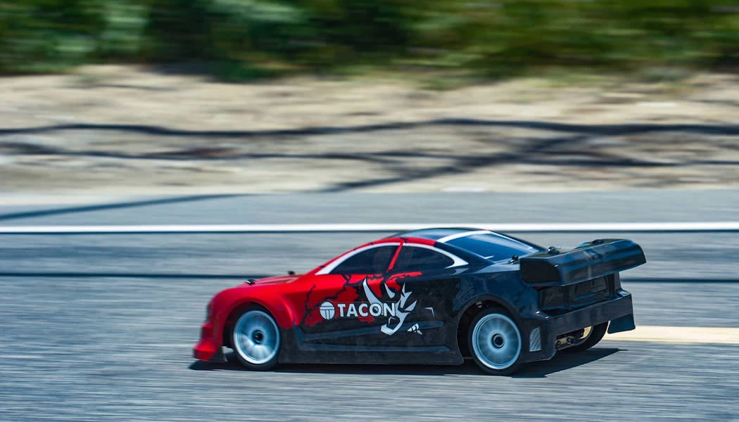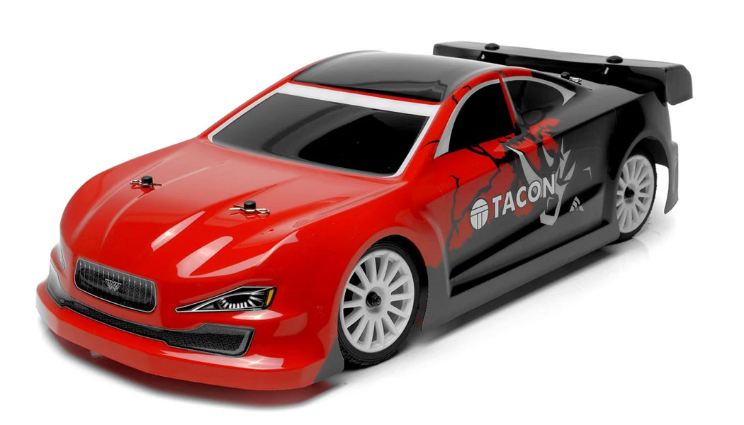 The Tacon is a 1/10 scale on road car . It was designed from the ground up with pure performance in mind. Performance features derived from 1/8 scale vehicles have been shrunken down in size and engineered to deliver the utmost performance in a small on road car package. A 2mm thick aluminum chassis serves as the base of this on road car. Mounted on the front and rear is 2.5mm thick 6061-T6 anodized aluminum shock towers towering over the metal geared fluid filled differentials. Attached to the robust towers are aluminum threaded oil filled shocks providing plush and ground hugging dampening. The steering tie rods and upper and lower arms are adjustable for fine tuning of the toe and camber, effectively altering the handling characteristics of the car.