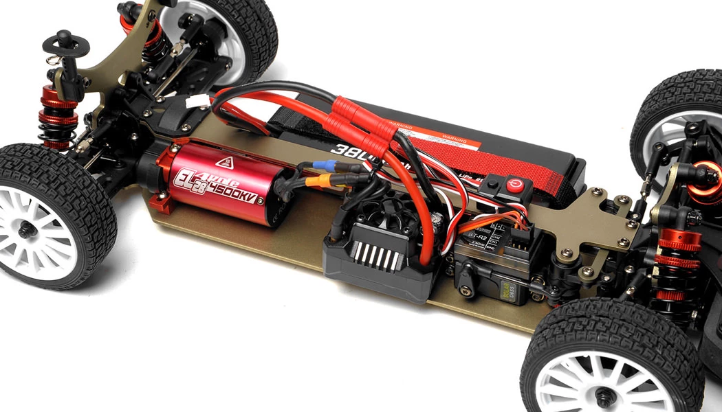This car has awesome power to weight ratio. Weighing in at slightly over 2 lbs, the vehicle is easily propelled by the 380 sized 4500KV brushless motor. A 80 amp programmable brushless electronic speed controller delivers the current efficiently through an included 7.4v 3800mah LIPO battery. All of this power transfers through a shaft driven four wheel drive system providing ground clawing action through the performance wheels and rally spec tires.