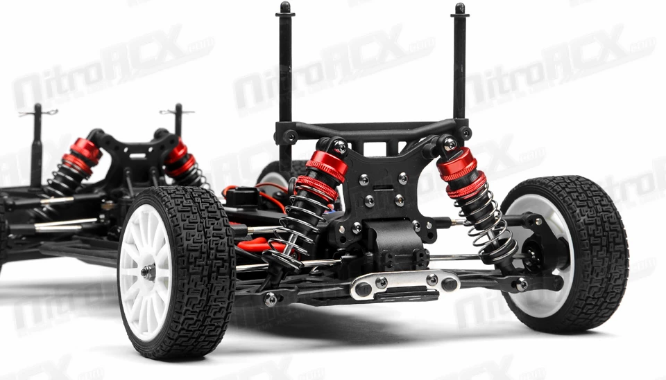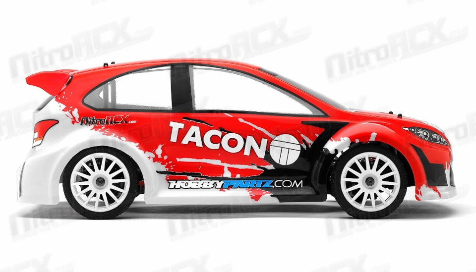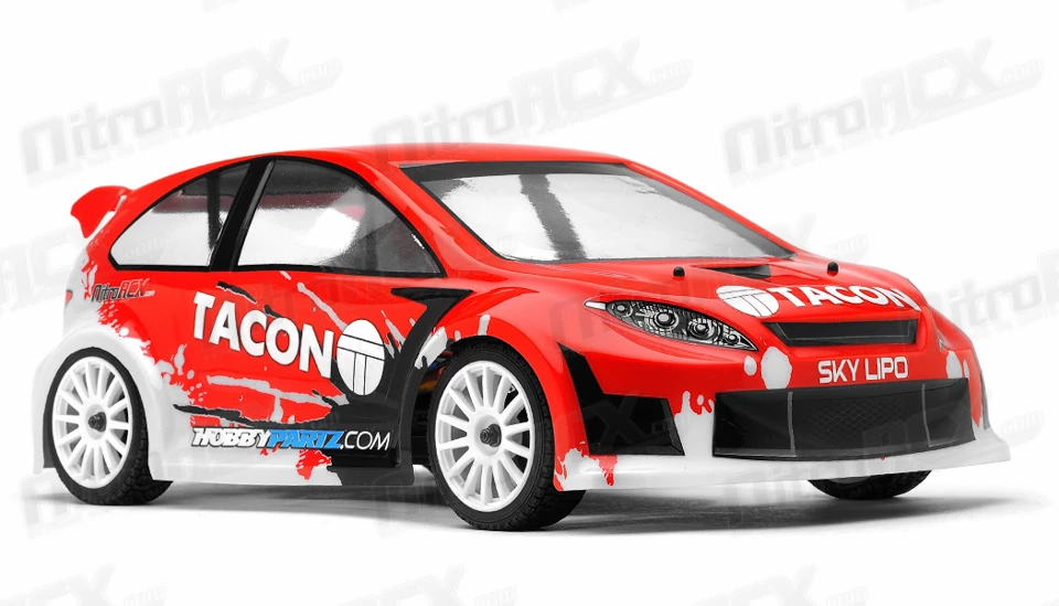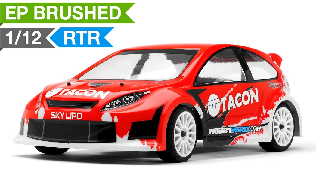 The Tacon Ranger is a 1/12 scale Rally car. It was designed from the ground up with pure performance in mind. Performance features derived from 1/8 scale trucks and buggies have been shrunken down in size and engineered to deliver the utmost performance in a small rally car package. A composite chassis serves as the base of this rally car. Mounted on the front and rear is thick composite shock towers towering over the planetary geared fluid filled differentials. Attached to the robust towers are aluminum capped, threaded coil over, oil filled shocks providing plush and ground hugging dampening. The steering tie rods and upper and lower arms are adjustable for fine tuning of the toe and camber, effectively altering the handling characteristics of the car.