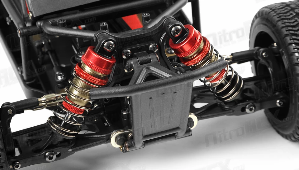 The Cavalry has a roll cage body designed with durability and performance in mind, combined with a wing on the rear end, the buggy handles exceptionally well on bumpy terrain and responds quickly with throttle and brake inputs while mid flight off of a jump. The longer stroke rear shock mounted to the rear of the cage allows this buggy to have a bit more travel than its other brothers of the same class. This buggy will put a huge smile on your face when you see it four wheel power sliding through a corner spitting dirt and debris out the rear end or flying over triples easily correcting itself landing on the perfect transition.
