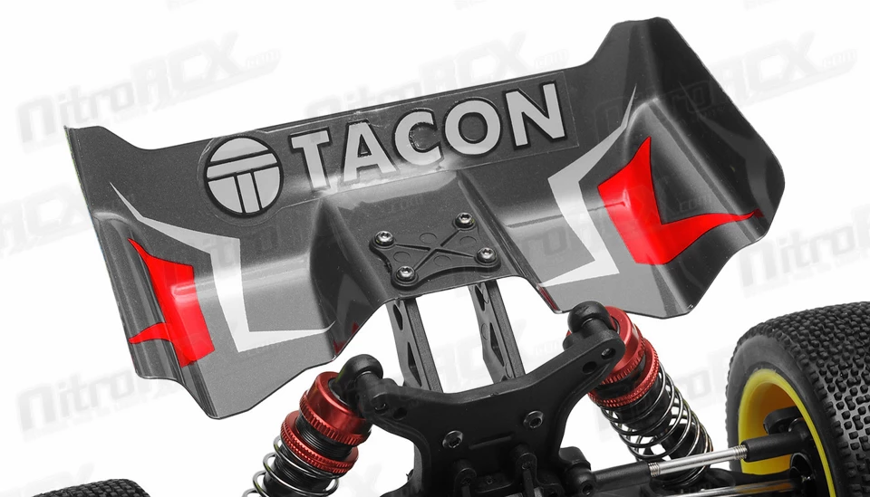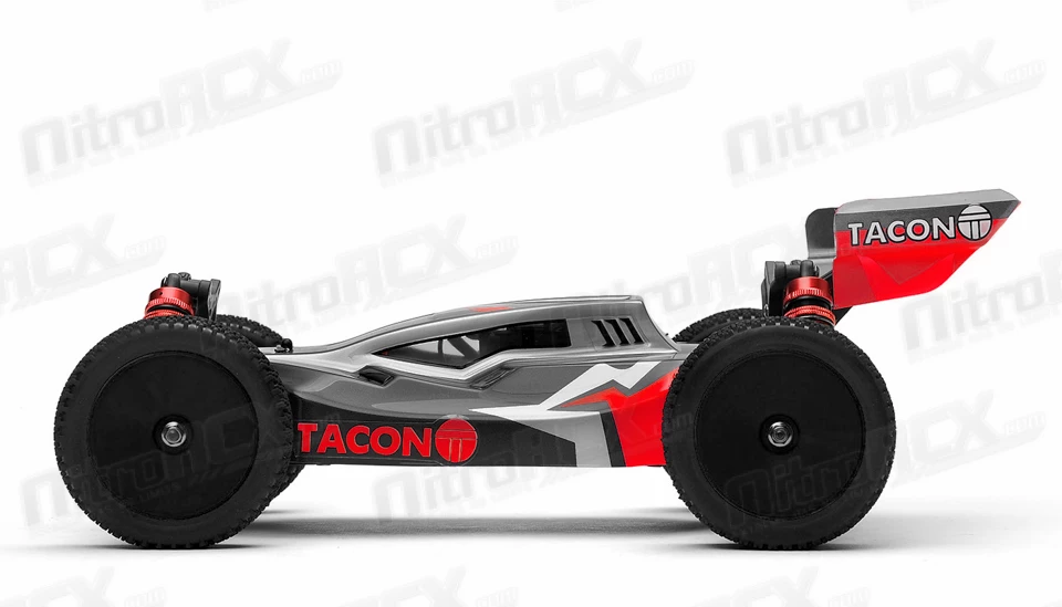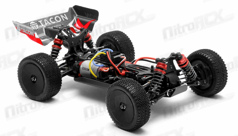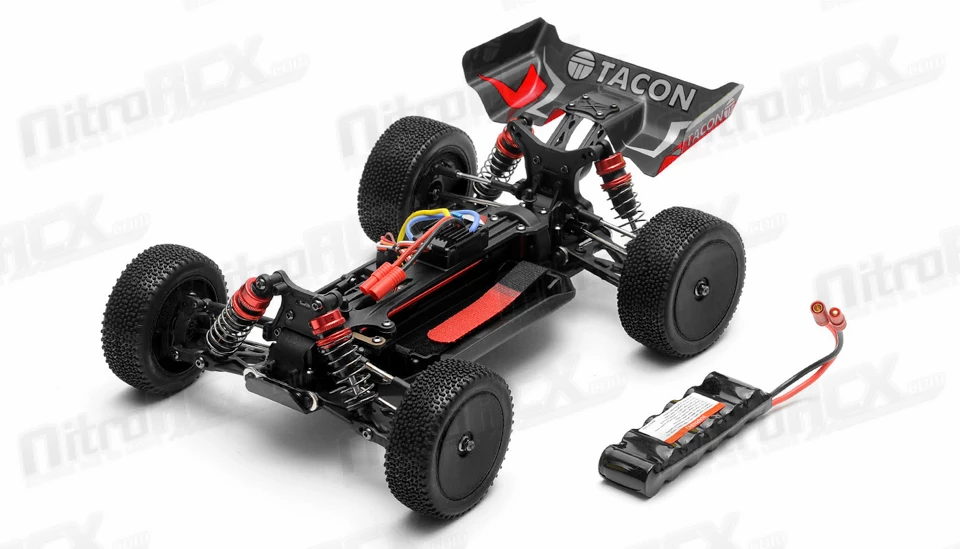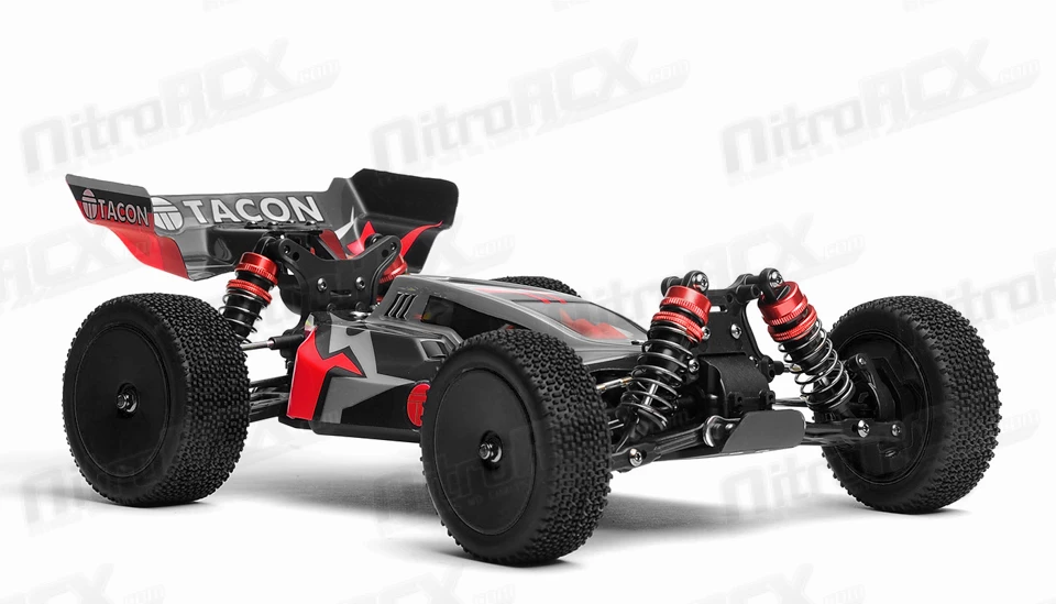 The Tacon Soar is a 1/14 scale Buggy. It was designed from the ground up with pure performance in mind. Performance features derived from 1/8 scale trucks and buggies have been shrunken down in size and engineered to deliver the utmost performance in a smaller buggy package. A composite chassis serves as the base of this buggy. Mounted on the front and rear is thick composite shock towers towering over the planetary geared fluid filled differentials. Attached to the robust towers are aluminum capped, coil over adjustable, oil filled shocks providing plush and ground hugging dampening. The steering tie rods and upper and lower arms are adjustable for fine tuning of the toe and camber, effectively altering the handling characteristics of the buggy over varying terrain.