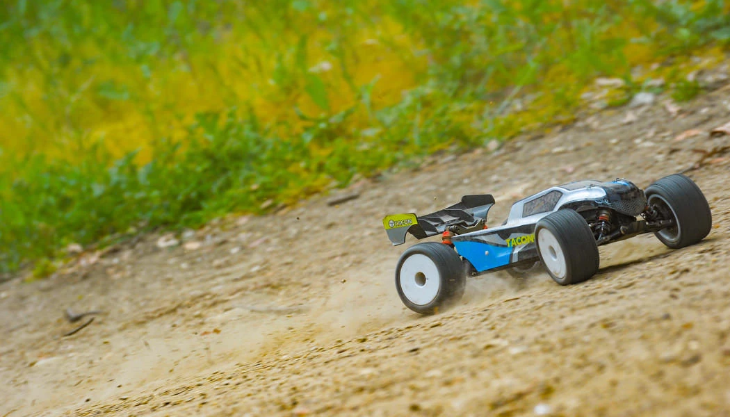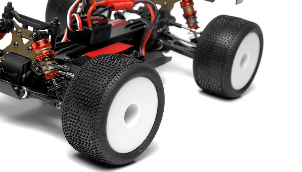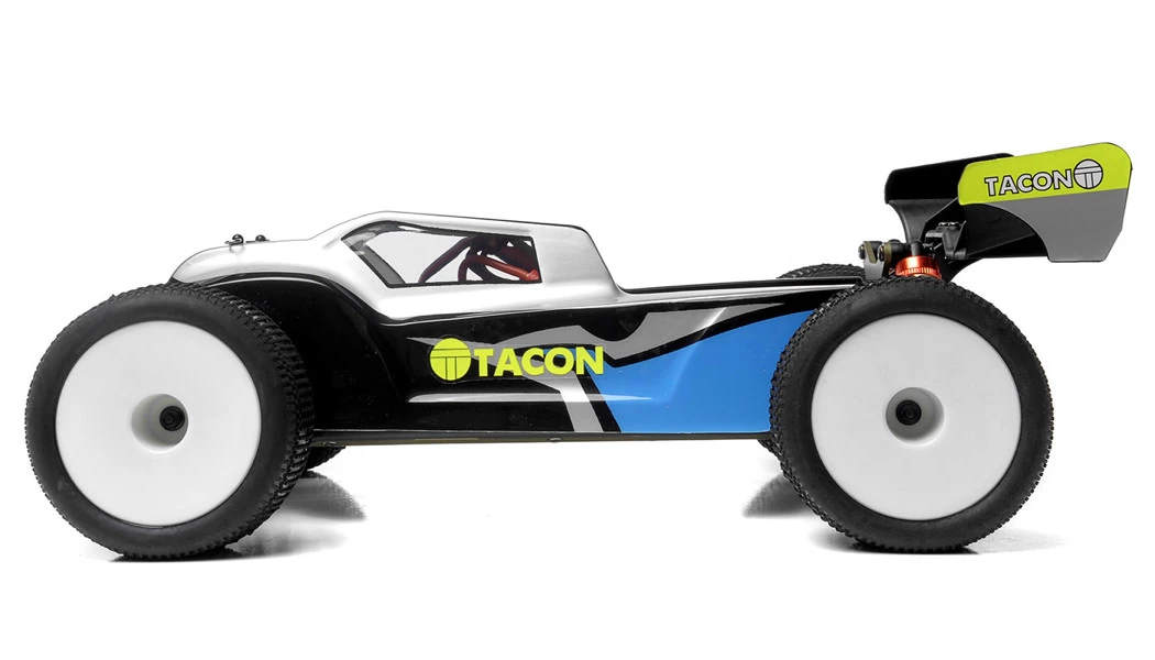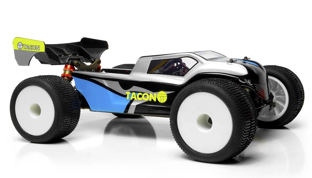 The Tacon is a 1/14 scale truggy . It was designed from the ground up with pure performance in mind. Performance features derived from 1/8 scale trucks and buggies have been shrunken down in size and engineered to deliver the utmost performance in a small truggy car package. A 2mm thick aluminum chassis serves as the base of this truggy car. Mounted on the front and rear is 2.5mm thick 6061-T6 anodized aluminum shock towers towering over the metal geared fluid filled differentials. Attached to the robust towers are aluminum threaded oil filled shocks providing plush and ground hugging dampening. The steering tie rods and upper and lower arms are adjustable for fine tuning of the toe and camber, effectively altering the handling characteristics of the car.