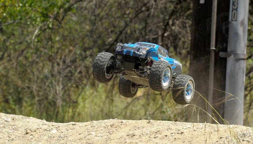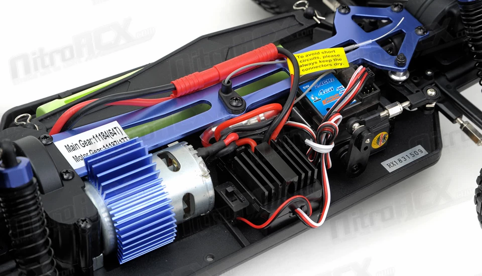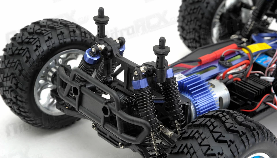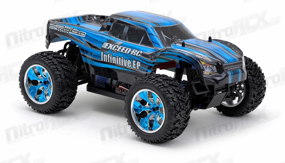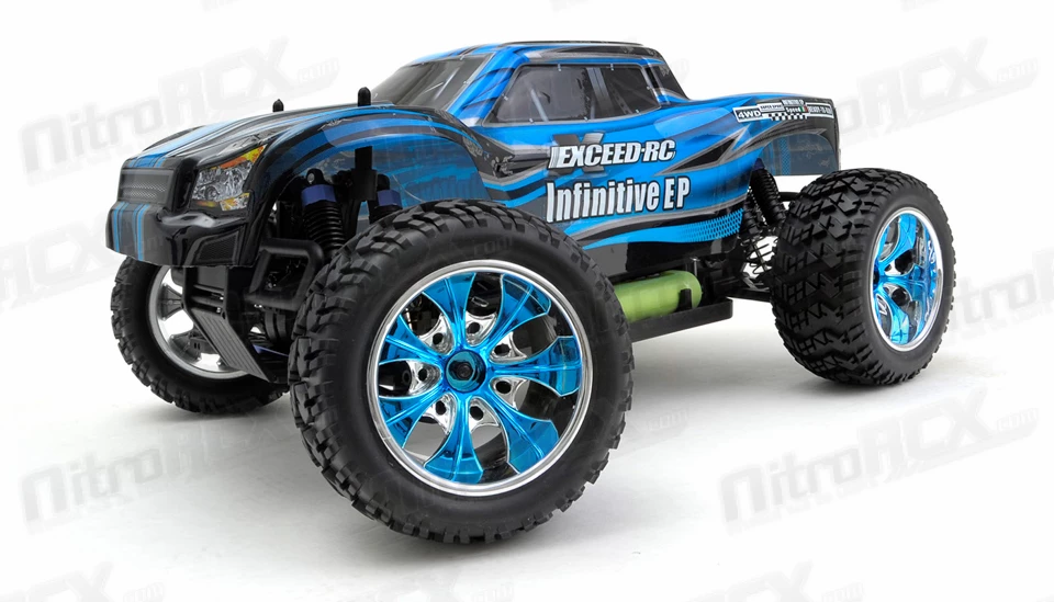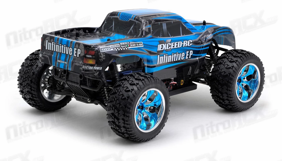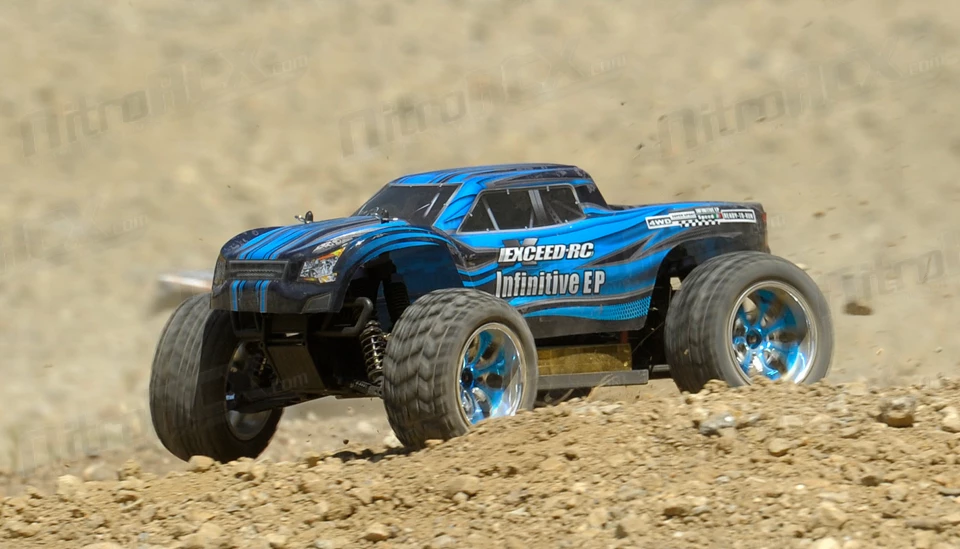 The Exceed RC Infinitive EP Monster Truck is packed with loads of features that will provide hours of action packed off road smashing. The 2.4ghz transmitter and receiver system ensures you will have excellent communication between driver and vehicle. The transmitter also allows dual-rate adjustments for throttle and steering so you can fine tune the power delivery and steering control of this truck. The power-train is reinforced and will handle extreme terrain. Metal geared front and rear differentials are driven by an aluminum center driveshaft and distributes the power to all four wheels. The power department is handled by a brushed 540 motor and supported by a 7.2v 1800mah Ni-Mh battery with charger included. Camber and toe settings are adjustable via turnbuckle linkages which allow you to make precise adjustments for the terrain your truck is smashing through. The high ground clearance paired with the large wheels and tires ensures this truck climbs through the toughest obstacles. This truck comes out the box completely ready to run with the exception of 4 AA batteries for the transmitter. Simply pull the truck out, charge the battery and your ready tame the unknown.