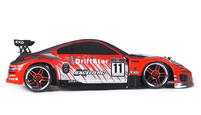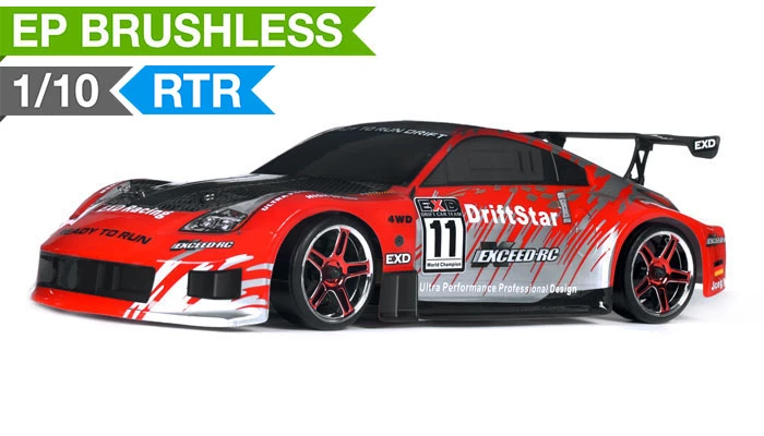 The EXCEED RC Electric Drift Star model represents a new generation of 1/10 scale on road drift cars. This ready to run Drift Star car is electric powered and perfect for indoor or outdoor drifting. Based on our popular and durable on road electric powered car, this drift version adds specially designed solid compound drift tires pre-mounted on high performance wheels. Combined with a powerful programmable 45amp brushelss esc and brushless motor, this Driftstar is capable of extreme drift angles and speed. The Drift Star is equipped with a four wheel driven drive train for consistent drift action on a wide variety of surfaces.