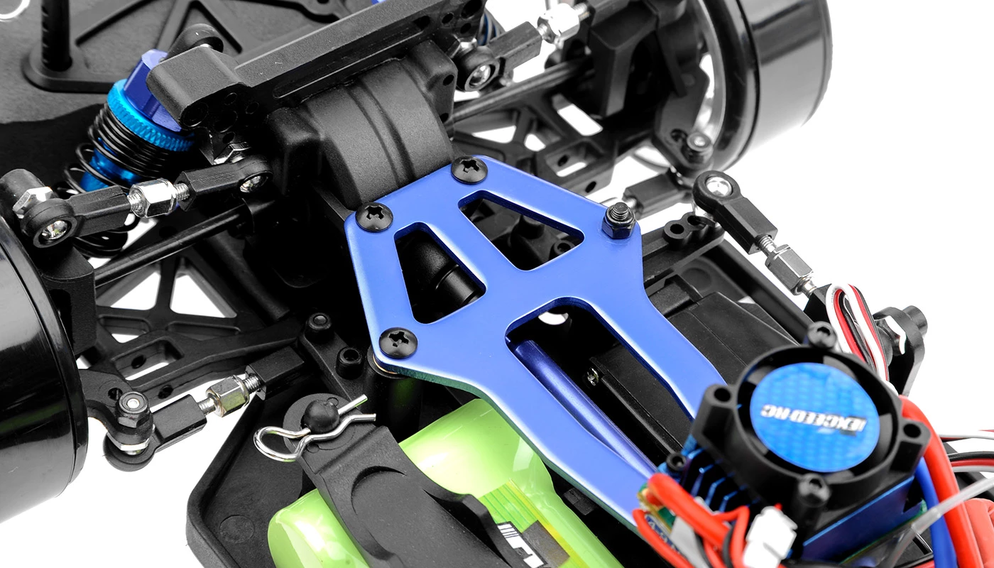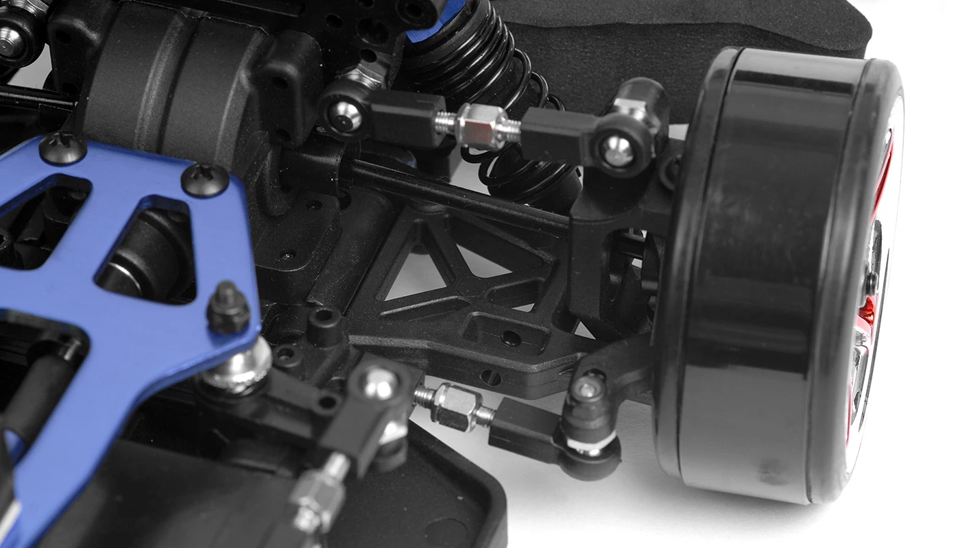 It is also equipped with aluminum threaded shock bodies which allows the preload of the springs to be quickly and easily tuned. The camber and toe are also easily adjusted through the use of aluminum turnbuckles. These combined features allow the user to quickly and easily tune the suspension geometry, letting the user get the most out of the Brushless DriftStar platform.