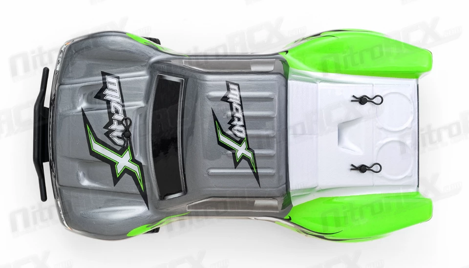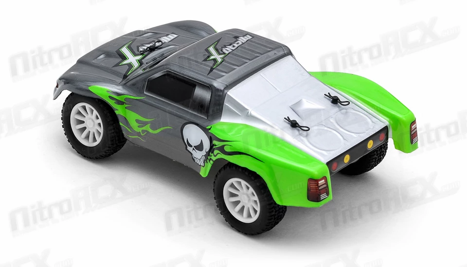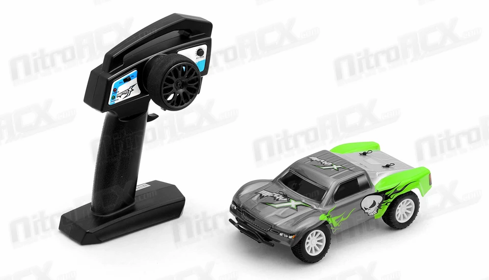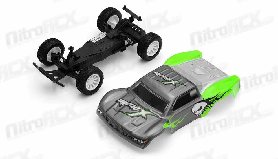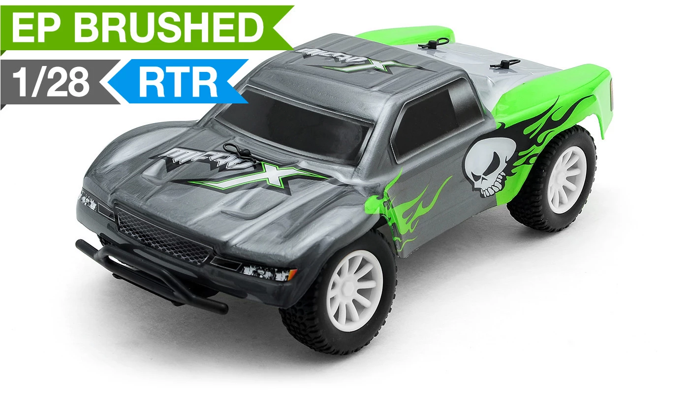 MicroX Racing releases its smallest most compact remote control short course truck to hit the market. Constructed on an molded composite chassis this Short Course Truck sports an agile 2WD drive train. A powerful brushed micro motor delivers tire spinning torque and speed to this already small and light weight chassis. Realistic Short Course Truck styling, race wheels, tires, and details keep things fun and exciting. The 1/28-scale electric RTR 2WD Short Course Truck has all the features you would want in a hobby grade radio control vehicle. Proportional digital throttle control, proportional digital steering control, high current electronic speed controller and lithium battery. The vehicle is ready to run and comes with a rechargeable internal battery pack and USB charger. This Short Course Truck is fully equipped to attack your home made race course. All you need to do is take it out of the box, charge the battery and let it rip!