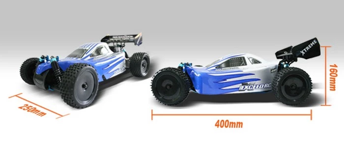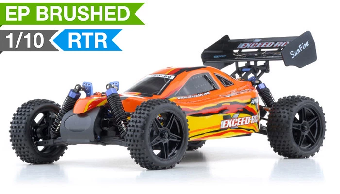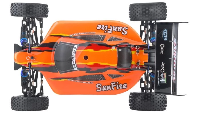 The Exceed RC Sunfire EP Buggy is packed with loads of features that will provide hours of action packed off road smashing. The 2.4ghz transmitter and receiver system ensures you will have excellent communication between driver and vehicle. The transmitter also allows dual-rate adjustments for throttle and steering so you can fine tune the power delivery and steering control of this buggy. The power-train is reinforced and will handle extreme terrain. Metal geared front and rear differentials are driven by an aluminum center driveshaft and distributes the power to all four wheels. The power department is handled by a brushed 540 motor and supported by a 7.2v 1800mah Ni-Mh battery with charger included. Camber and toe settings are adjustable via turnbuckle linkages which allow you to make precise adjustments for the terrain your buggy is smashing through. The high down force wing and knobby tires ensures this buggy is planted to the ground at high speeds. This buggy comes out the box completely ready to run with the exception of 4 AA batteries for the transmitter. Simply pull the buggy out, charge the battery and your ready tame the unknown.