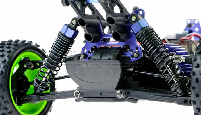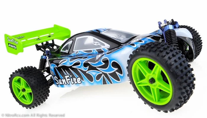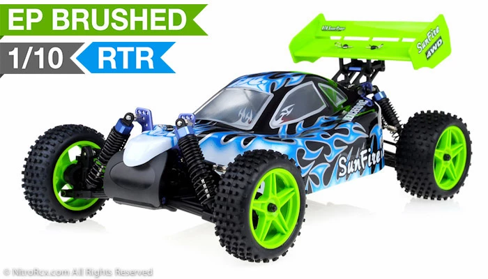 The Exceed RC Sunfire EP Buggy is packed with loads of features that will provide hours of action packed off road smashing. The 2.4ghz transmitter and receiver system ensures you will have excellent communication between driver and vehicle. The transmitter also allows dual-rate adjustments for throttle and steering so you can fine tune the power delivery and steering control of this buggy. The power-train is reinforced and will handle extreme terrain. Metal geared front and rear differentials are driven by an aluminum center driveshaft and distributes the power to all four wheels. The power department is handled by a brushed 540 motor and supported by a 7.2v 1800mah Ni-Mh battery with charger included. Camber and toe settings are adjustable via turnbuckle linkages which allow you to make precise adjustments for the terrain your buggy is smashing through. The high down force wing and knobby tires ensures this buggy is planted to the ground at high speeds. This buggy comes out the box completely ready to run with the exception of 4 AA batteries for the transmitter. Simply pull the buggy out, charge the battery and your ready tame the unknown.