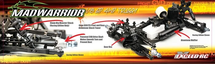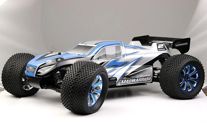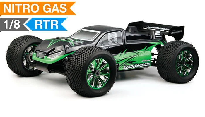 The impressiveness of the MadWarrior Truggy can be seen right out of the box from the well-built interior to the magnificent exterior designs. From the front to the back bumper all pieces have been built to last. Included in the Truggy are aluminum muffler for superior protection and better looks, and heavy duty metal gear steering servo so you don t have to worry about it breaking. Even the rims are now hardened chrome rims and colossal tires to triumph over the world. Use the MadWarrior to climb off road terrain, stony hills, rocky backyards, or wherever the road may take you. MadWarrior will lead the way to new standards for the RC world and conquer all.
