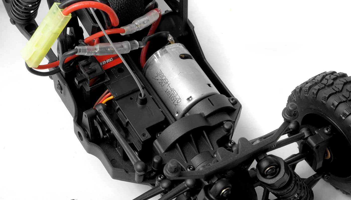 ?The radio features a pistol-grip design with 2 channel functionality, steering and throttle dual rates, steering and throttle exponential adjustments, servo reversing. The radio prevents frequency conflicts automatically and changes channels if there is any interference. You’ll have professional-level control in one easy ready to run package. Propelled by a 380 sized high performance brushed motor. A two in one brushed electronic speed and receiver delivers the current efficiently through an included 7.2v 1100mah Ni-Mh battery and charger.
