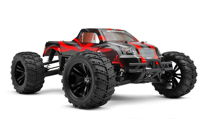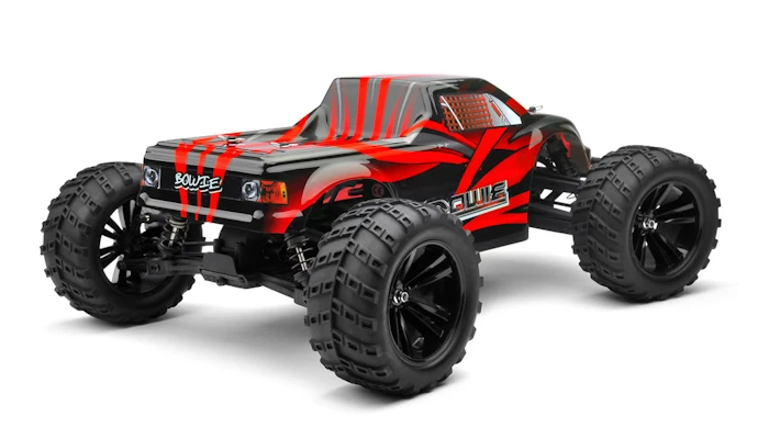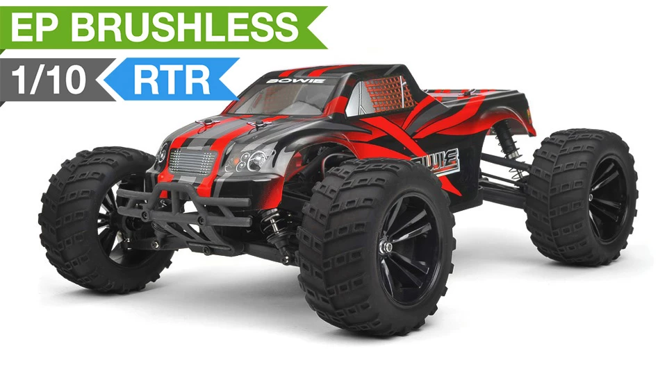 The Iron Track Bowie four wheel drive brushless truck is totally transformed. If you thought the brushed version was fast. This brushless system will make your palms and fingers sweat! Injecting the revolution of electric motor and power systems to this truck results in a 45 amp programmable splash proof electronic speed controller and a torquey 3215kv brushless motor all juiced by a 7.4v 2000mah Lithium Polymer battery with an impressive 30C continuous and 50C burst rating. The Bowie is equipped with all the quality features you would expect from a hobby grade radio control truck. High performance front and rear differentials and an aluminum center drive shaft ensure maximum power transfer and superb reliability from the powerful brushless power system. Adjustable width suspension arms and oil filled shocks provide the plush terrain taming response to allow maximum control during high speeds. The steering servo supports more than 6 pounds of torque to allow precise corning and the ability to hold that drift or line when you?re smashing on that throttle. The 2.4ghz dedicated receiver and transmitter systems allows precise control and tuneability. Throttle and steering dual rates allow you to get comfortable with the increase in power and speed along with throttle and steering trims to get the truck tracking precisely. You can tame a variety of terrain with this truck. The wide all terrain tires allow the rubber to grip at any surface with ease. The pre-cut and pre-painted body allows you to run your truck as soon as you get the battery charged. This extreme Iron Track Bowie is ready for action. Be prepared to be blown away by the speed.?