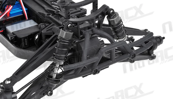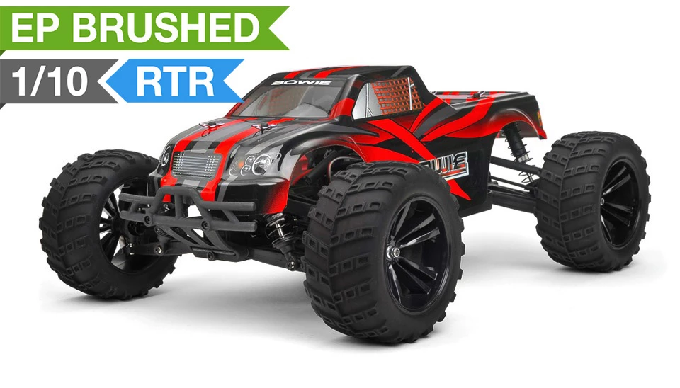 The hot new 1/10 Scale Iron Track Bowie ready to run truck has loads of awesome features. The 2 in 1 electronic speed control and receiver unit pumps out 20amp continuous and 320amps of maximum burst current to the 550 brushed motor delivering ground pounding acceleration. All of this power induced by the included 7.2v Ni-Mh battery with charger included. Make no doubt that this ready to run radio control truck is hobby grade. The 2.4ghz radio allows precise proportional control of this powerful truck. The steering servo delivers more than 6 pounds of torque to steer this truck in the right direction. Transferring all this instant electric power to the all terrain tires is an efficient shaft driven 4 wheel drive system. The geared front and rear differentials driven by an aluminum center drive shaft ensure maximum traction and reliability in the roughest terrain. The oil filled shocks allow the suspension to soak up all the bumps and rough stuff you throw at it. A pre-cut and factory painted body permits you to get into instant action once you open the box and get everything charged. The Bowie delivers smooth handling and precise response for you to enjoy the thrill of radio control truck action. With the Bowie you are guaranteed to have hours of fun and excitement!