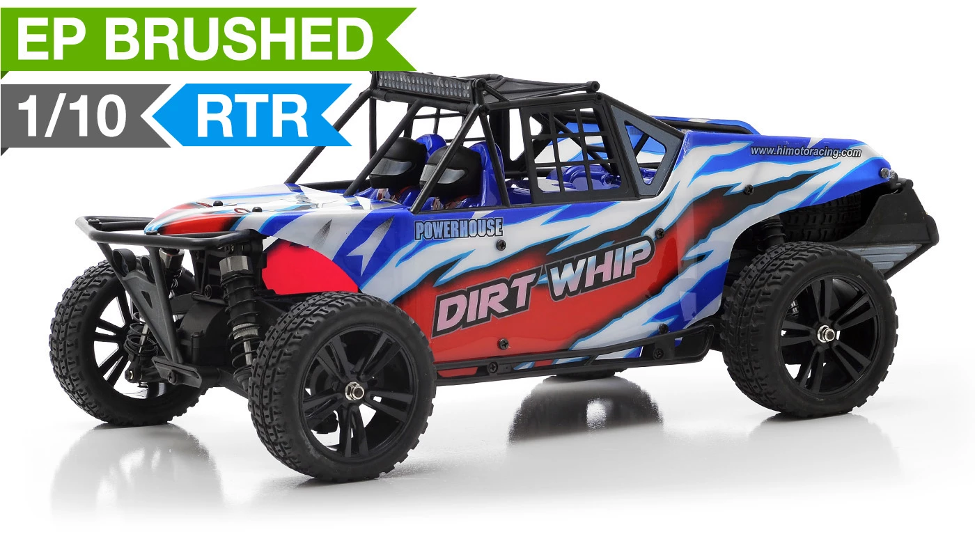 The hot new 1/10 Scale Iron Track Dirt Whip Truck ready to run truck has loads of awesome features. The 2 in 1 electronic speed control and receiver unit pumps out 20amp continuous and 320amps of maximum burst current to the 550 brushed motor delivering ground pounding acceleration. All of this power induced by the included 7.2v Ni-Mh battery with charger included. Make no doubt that this ready to run radio control truggy is hobby grade. The 2.4ghz radio allows precise proportional control of this powerful truck. The steering servo delivers more than 6 pounds of torque to steer this truck in the right direction. Transferring all this instant electric power to the knobby tires is an efficient shaft driven 4 wheel drive system. The geared front and rear differentials driven by an aluminum center drive shaft ensure maximum traction and reliability in the roughest terrain. The oil filled shocks allow the suspension to soak up all the bumps and rough stuff you throw at it. A pre-cut and factory painted body permits you to get into instant action once you open the box and get everything charged. The Dirt Whip delivers smooth handling and precise response for you to enjoy the thrill of radio control truck action. With the Dirt Whip you are guaranteed to have hours of fun and excitement!
