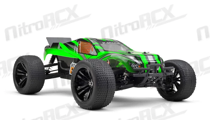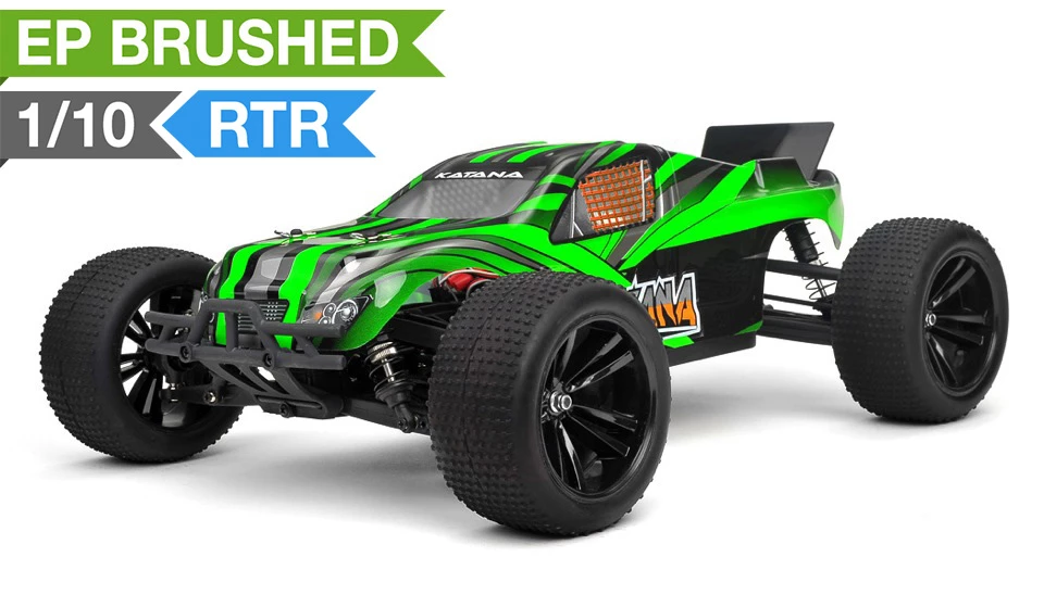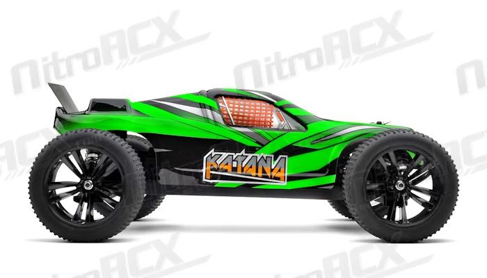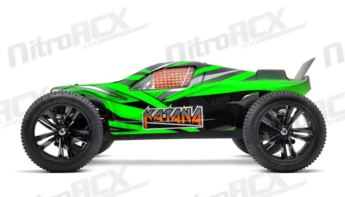 The hot new 1/10 Scale Iron Track Katana ready to run truggy has loads of awesome features. The 2 in 1 electronic speed control and receiver unit pumps out 20amp continuous and 320amps of maximum burst current to the 550 brushed motor delivering ground pounding acceleration. Make no doubt that this ready to run radio control truggy is hobby grade. The 2.4ghz radio allows precise proportional control of this powerful truggy. The steering servo delivers more than 6 pounds of torque to steer this truggy in the right direction. Transferring all this instant electric power to the knobby tires is an efficient shaft driven 4 wheel drive system. The geared front and rear differentials driven by an aluminum center drive shaft ensure maximum traction and reliability in the roughest terrain. The oil filled shocks allow the suspension to soak up all the bumps and rough stuff you throw at it. A pre-cut and factory painted body permits you to get into instant action once you open the box and get everything charged. The Katana delivers smooth handling and precise response for you to enjoy the thrill of radio control truggy action. With the Katana you are guaranteed to have hours of fun and excitement!