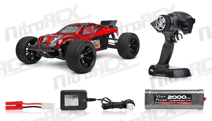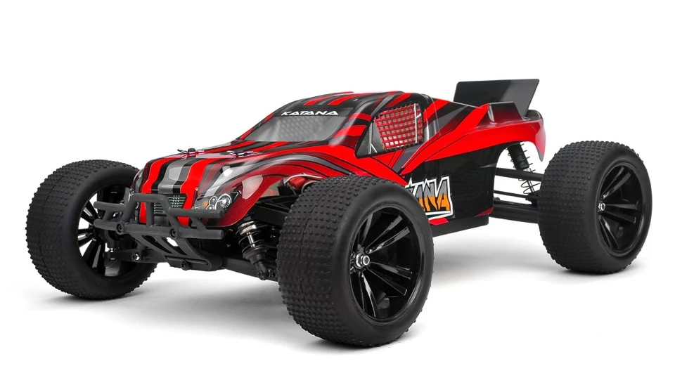 The hot new 1/10 Scale Iron Track Katana ready to run truggy has loads of awesome features. The 2 in 1 electronic speed control and receiver unit pumps out 20amp continuous and 320amps of maximum burst current to the 550 brushed motor delivering ground pounding acceleration. All of this power induced by the included 7.2v Ni-Mh battery with charger included. Make no doubt that this ready to run radio control truggy is hobby grade. The 2.4ghz radio allows precise proportional control of this powerful truggy. The steering servo delivers more than 6 pounds of torque to steer this truggy in the right direction. Transferring all this instant electric power to the knobby tires is an efficient shaft driven 4 wheel drive system. The geared front and rear differentials driven by an aluminum center drive shaft ensure maximum traction and reliability in the roughest terrain. The oil filled shocks allow the suspension to soak up all the bumps and rough stuff you throw at it. A pre-cut and factory painted body permits you to get into instant action once you open the box and get everything charged. The Katana delivers smooth handling and precise response for you to enjoy the thrill of radio control truggy action. With the Katana you are guaranteed to have hours of fun and excitement!