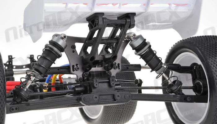 The suspension of the Zeige is optimized for Truggy racing featuring fully independent suspension front and rear. It allows the driver to adjust camber, toe, roll centers and many other tuning options to dial it in for the specific terrain its running on. The high volume big bore oil filled shock absorbers are also fully adjustable, allowing you to fine tune your dampening.