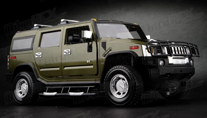 The Hummer H2 offers unparalleled off-road capability and plenty of style. The MZ model Hummer H2 is a fully licensed truck scaled down to 1:14. It is electric powered by included rechargeable AA batteries. It features full movement function with forward and reverse along with left and right steering. The working front and rear suspension lets it roll through uneven terrain. A high gloss paint job with chrome accents makes this Hummer a beautiful static model ready to be displayed. A detailed interior also lets you live the Hummer experience. It is ready to run out of the box with an included radio transmitter and charger for the rechargeable batteries.