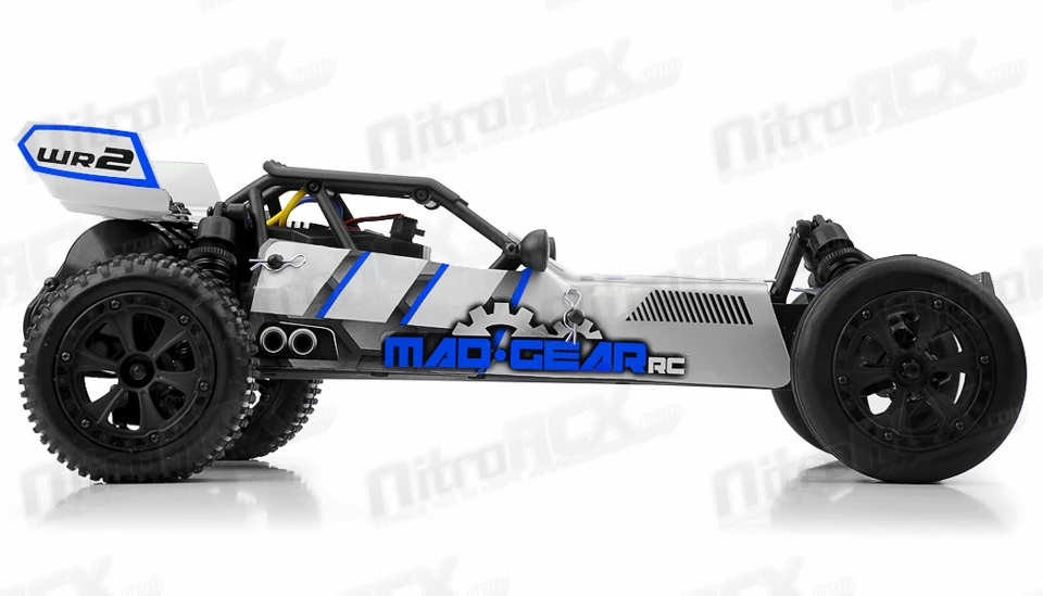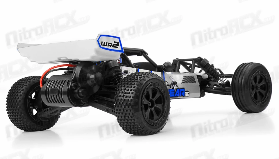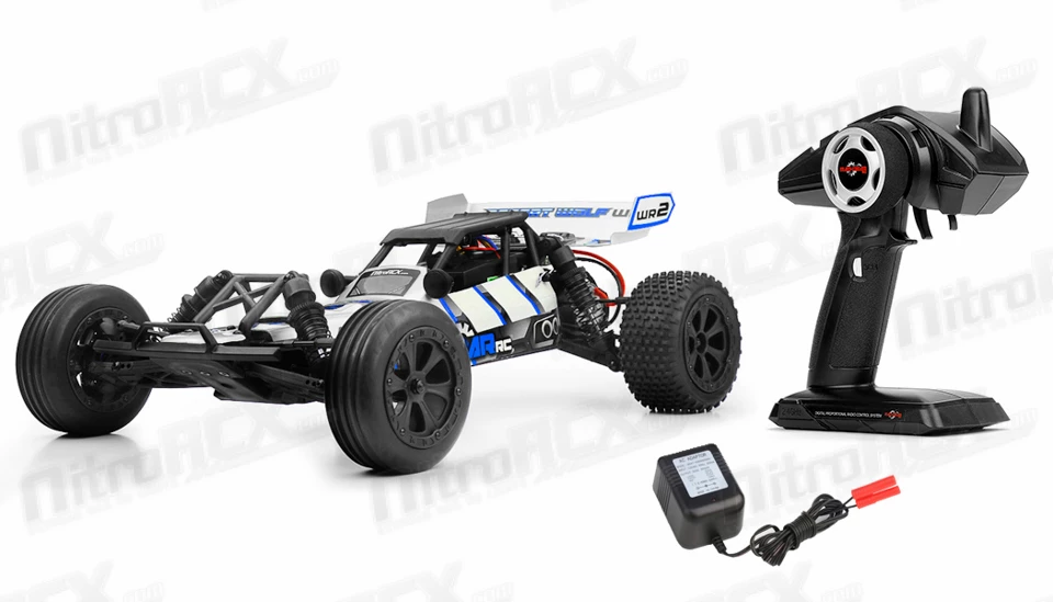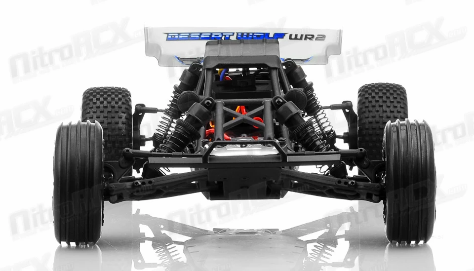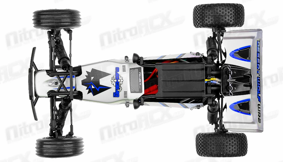 The Desert Wolf Baja buggy is a rear wheel drive 1/10th scale off-road 2 wheel drive electric vehicle. It comes equipped with fully adjustable suspension and long travel oil filled shocks providing the utmost performance in terrain dampening. The suspension package provides an ample amount of ground clearance allowing the driver to coast over the most technical of obstacles with ease. The power system is derived from a hi-torque 540 brushed motor and supported by a brushed waterproofed proportional electronic speed controller. The torque and power is transferred to the adjustable rear differential delivering power to the rear two wheels. Traction is obtained by the aggressive tread patterned off road rear tires. The entire power system is produced by a 1800mAh Ni-MH battery with charger included. Handling all the cornering and steering inputs is a 9kg rated waterproof standard sized servo. All this awesomeness is controlled by a frequency hopping 2.4ghz radio system which will ensure positive feedback and interference free operation for plenty of fun.
