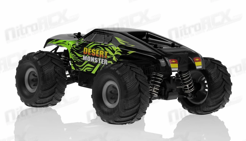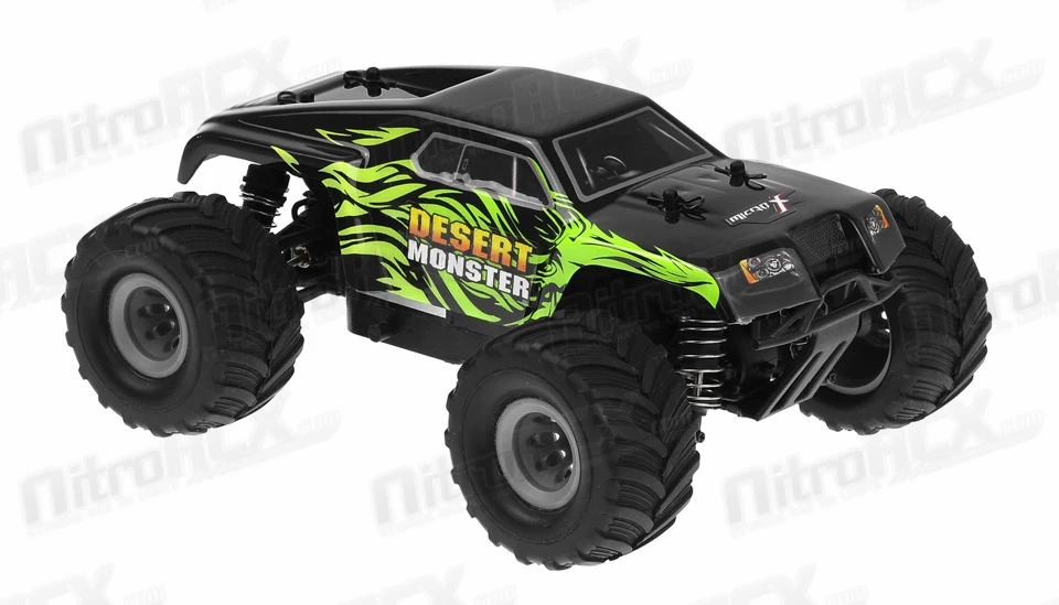 MicroX Racing introduces its smallest most compact desert monster truck to hit the market. Constructed on a molded composite chassis this truck sports an agile 4WD shaft driven drivetrain. A powerful brushed micro motor delivers tire spinning torque and speed to this already small and light weight chassis. Realistic desert monster truck styling and details keep things fun and exciting. The 1/24-scale electric RTR 4WD desert monster truck has all the features you would want in a hobby grade radio control vehicle. Proportional digital control, dedicated steering servo, high current electronic speed controller and battery. The vehicle is ready to run and comes with a rechargeable battery pack and charger. This monster truck is fully equipped to attack the track. All you need to do is take it out of the box, charge the battery and let it rip!