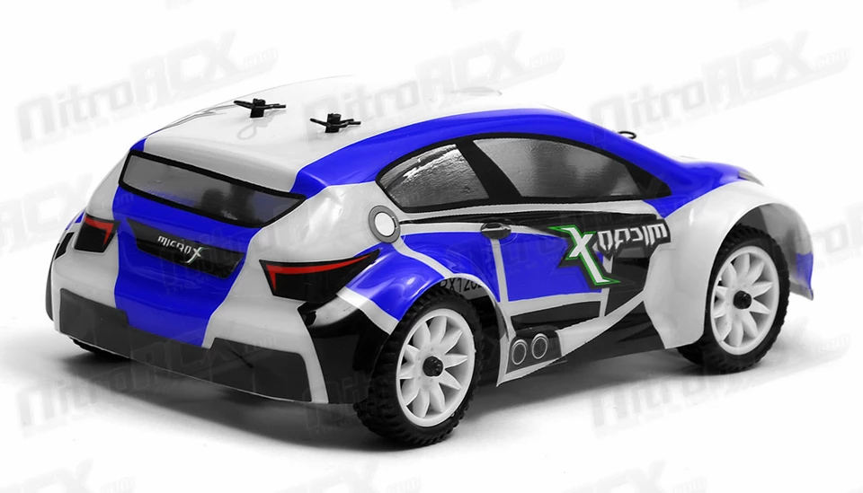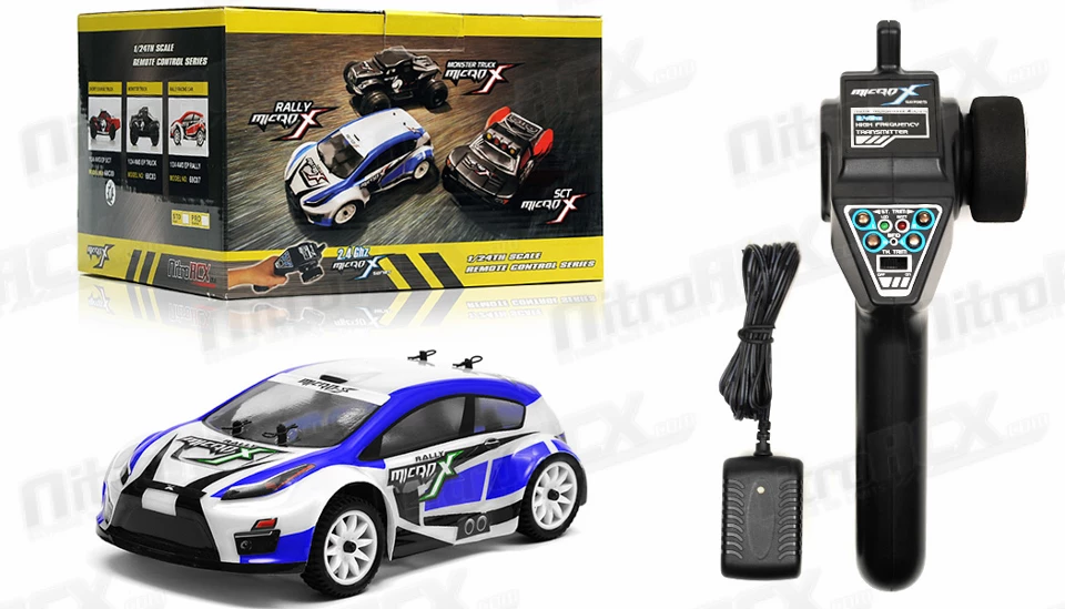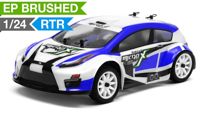 MicroX Racing introduces its smallest most compact rally car to hit the market. Constructed on an molded composite chassis this truck sports an agile 4WD shaft driven drive train.? A powerful brushed micro motor delivers tire spinning torque and speed to this already small and light weight chassis. Realistic rally car hatchback styling and details keep things fun and exciting. The 1/24-scale electric RTR 4WD rally car has all the features you would want in a hobby grade radio control vehicle.? Proportional digital control, dedicated steering servo, high current electronic speed controller and battery. The vehicle is ready to run and comes with a rechargeable battery pack and charger. This Rally Car is fully equipped to attack the rally courses. All you need to do is take it out of the box, charge the battery and let it rip