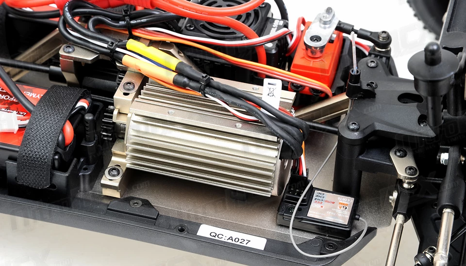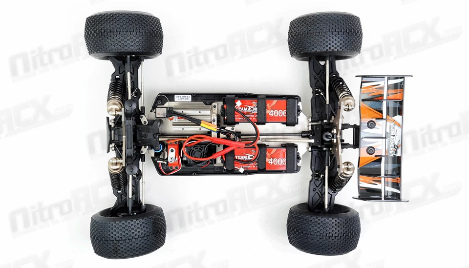 The drive train is also equipped with beefed up metal differentials and thick axle cups. Thick drive axles reach out to the wheel hubs with CVD joints in the front and traditional dog-bone style setup in the rear. There are no bushings on this vehicle, every rotating piece is treated with high quality sealed ball bearings for low drag and maximum rolling and rotating efficiency. Thick chassis braces mounted in strategic high leverage points ensure your hard jumps and landings do not warp or bend the chassis.Â
