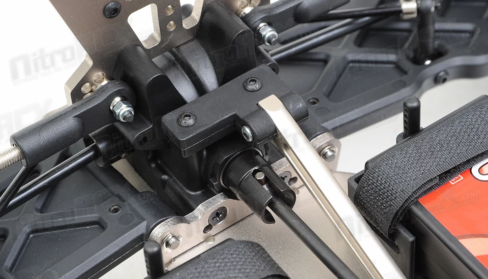 At both ends of the truggy, the C8ST has everything you’d expect from an all-out competition kit, including thick anodized aluminum steering link with ackerman adjustment, adjustable roll center, thick adjustable turnbuckle links, aligned king pin and universal joint pivots, sway bars front and rear, steel adjustable turnbuckles, and adjustable shock mounting positions. There are tons of adjustment that can allow you to tune this truggy any way you want it handle. The factory settings are awesome straight out of the box for a wide range of running situations.Â