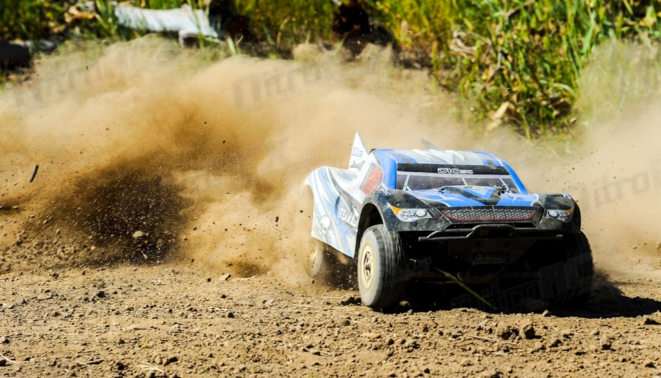The D10SC is a brushless powered short course truck which means instant power unlike its nitro powered counterparts that require revving up an internal combustion engine. The power is ready to rock and roll on tap! A 14.8v 4000mah 45C battery discharges its juice into a 100amp waterproof speed controller. Spinning all that power is a 3674 2400kv high torque brushless motor. This setup tortures the pavement and dirt.