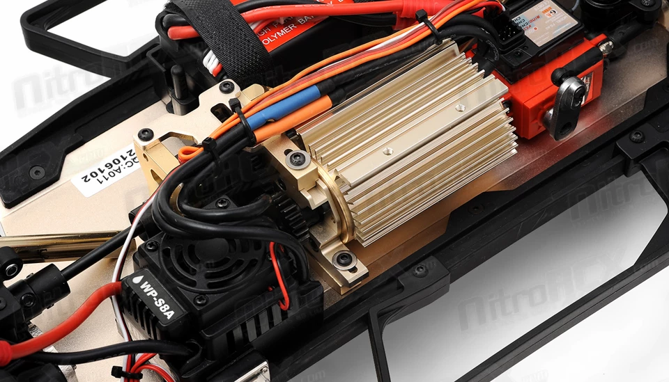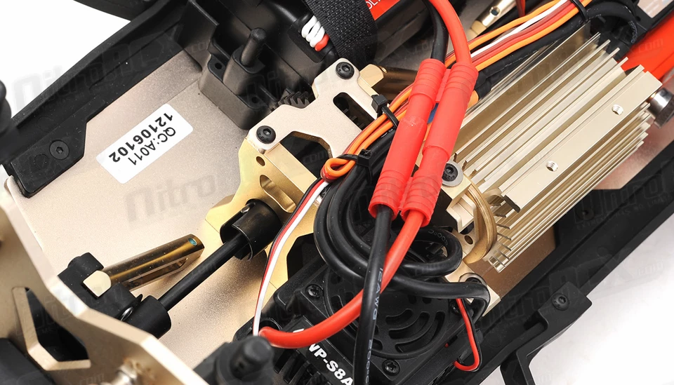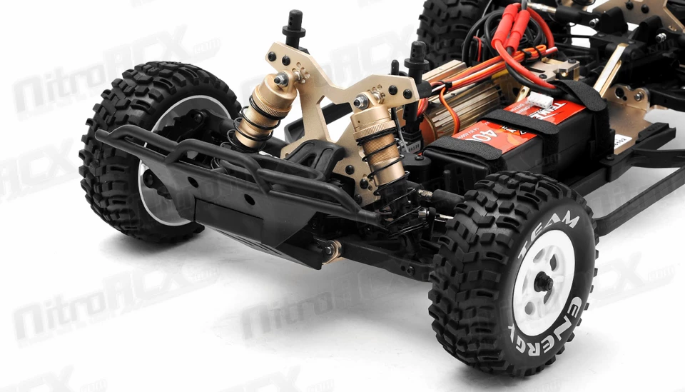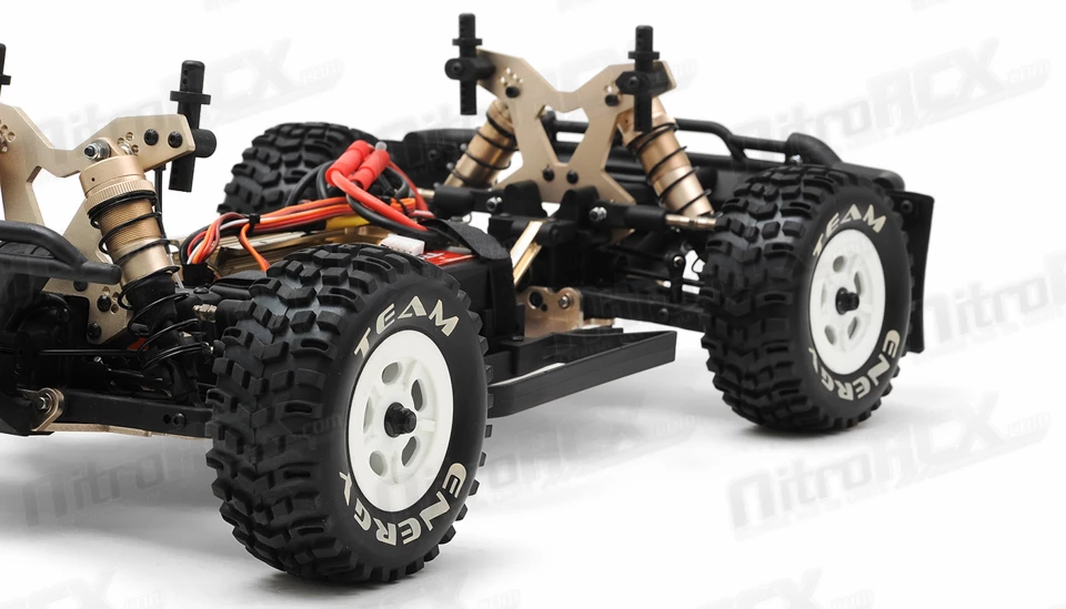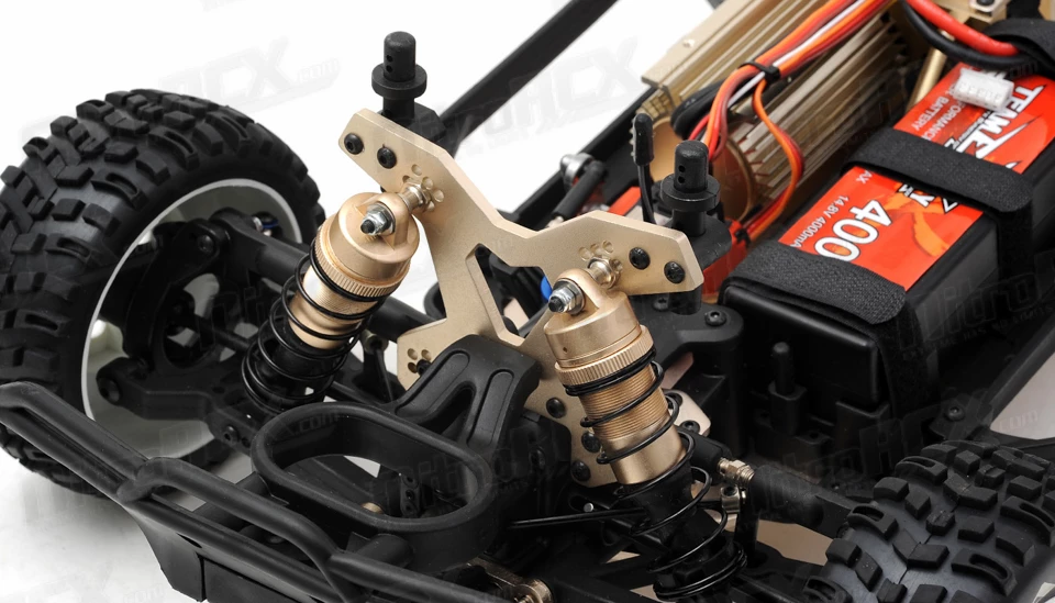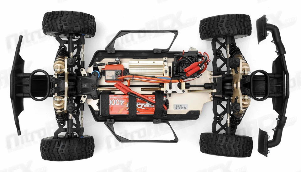 The drive train is also beefed up metal geared differentials and thick axle cups. Thick drive axles reach out to the wheel hubs with CVD joints in the front and traditional dog-bone style setup in the rear. There are no bushings on this vehicle; every rotating piece is treated with high quality sealed ball bearings for low drag and maximum rolling and rotating efficiency. Thick chassis braces mounted in strategic high leverage points ensure your hard jumps and landings do not warp or bend the chassis.