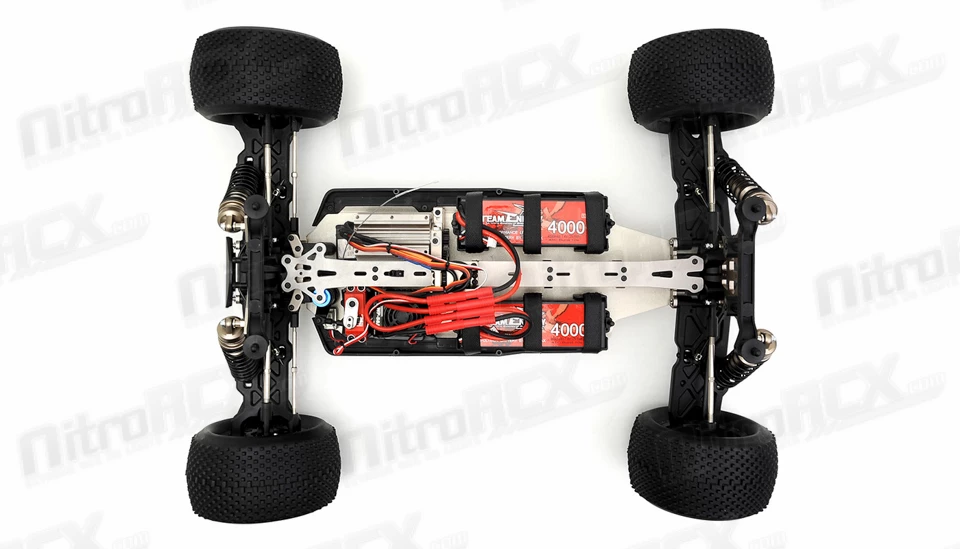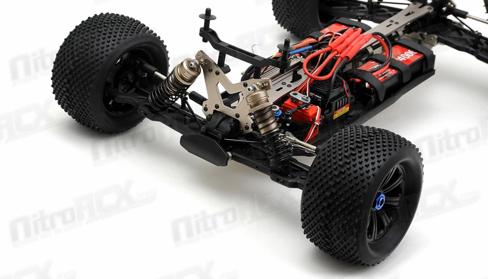 The drive train is also equipped with beefed up metal differentials and thick axle cups. Thick drive axles reach out to the wheel hubs with CVD joints in the front and traditional dog-bone style setup in the rear. There are no bushings on this vehicle, every rotating piece is treated with high quality sealed ball bearings for low drag and maximum rolling and rotating efficiency. Thick chassis braces mounted in strategic high leverage points ensure your hard jumps and landings do not warp or bend the chassis.Â