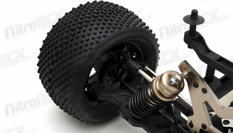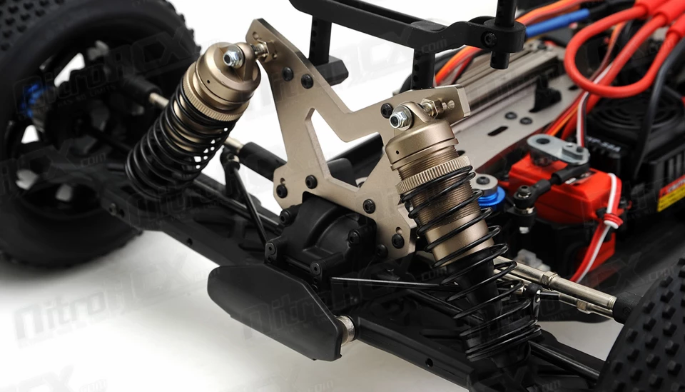 The M7DT also has fresh designed suspension arms featuring centerline shock mounts and an optimized anti-roll bar position. The new suspension arms were designed to work with the aluminum low center of gravity shock towers to improve and optimize the suspension geometry, making the M7DT more plush and forgiving in rougher terrain. 16mm Big Bore long travel aluminum and threaded oil filled shocks also help the buggy achieve maximum control over any terrain.Â