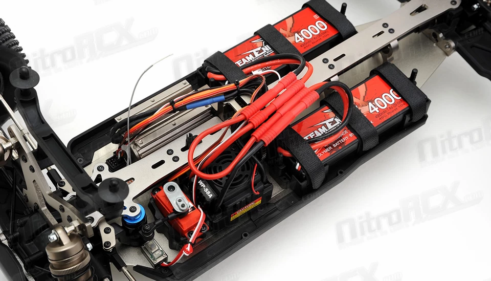 The M7DT is a brushless powered buggy which means instant power unlike its nitro powered counterparts that require revving up an internal combustion engine. The power is ready to rock and roll on tap! Dual 7.4v 4000mah battery discharges its juice into a 100amp waterproof speed controller. Spinning all that power is a 3674 2400kv high torque brushless motor. This setup tortures the pavement and dirt and makes wonderful dirt rooster tails.Â