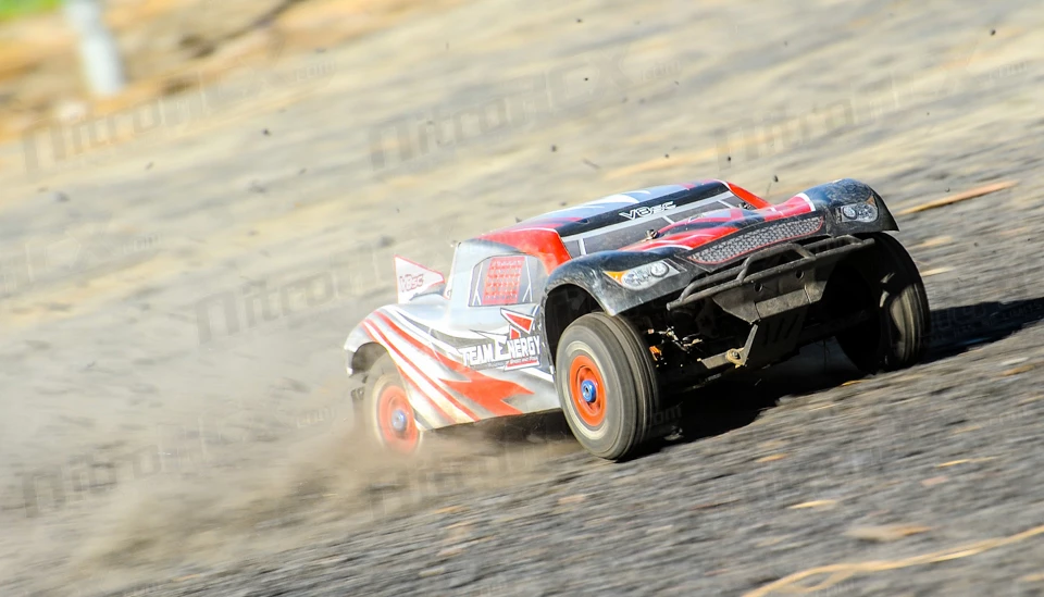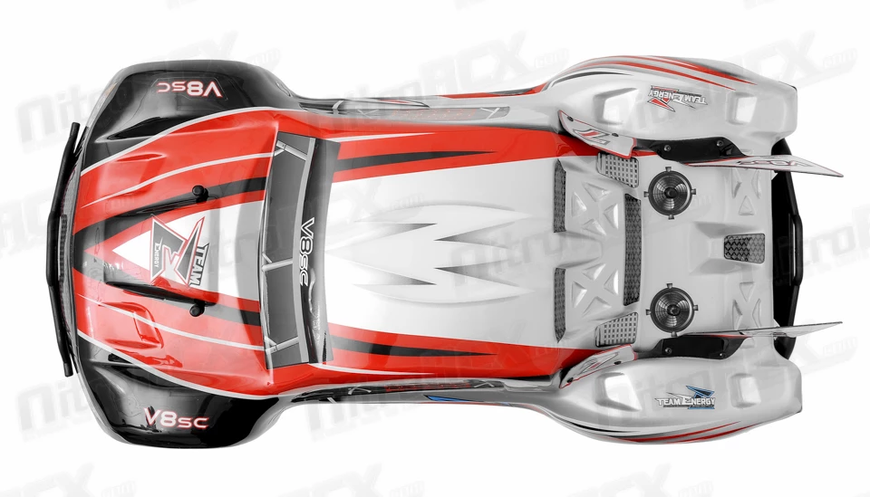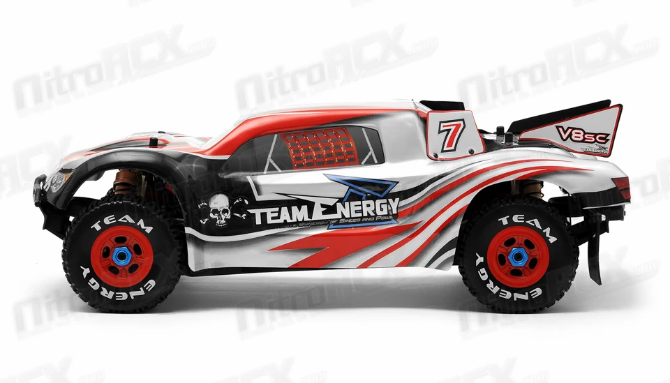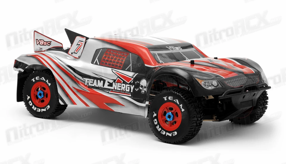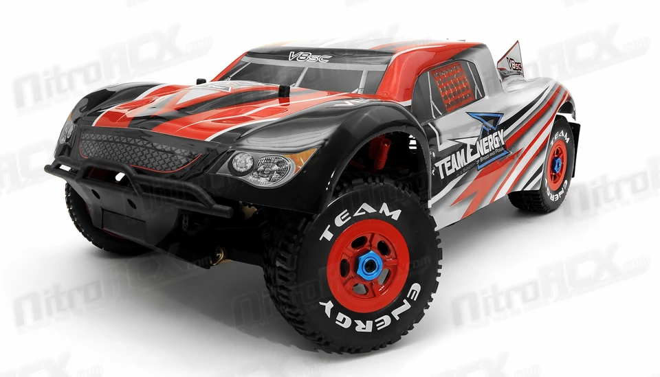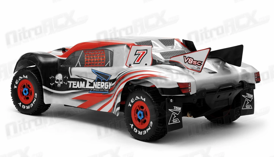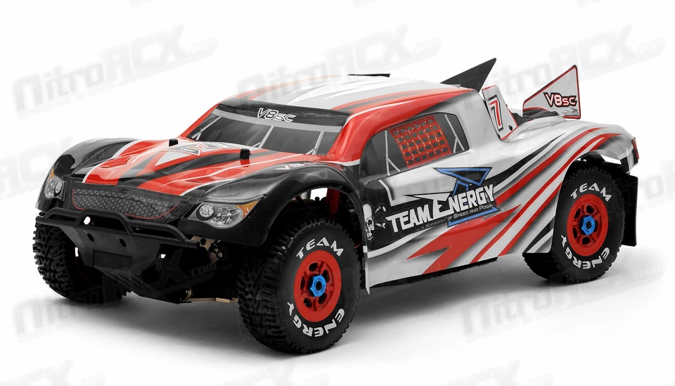 Team Energy has developed an all new 1/8 scale racing chassis. This machine is built burly to handle tough terrain while its suspension and controls handle like a precision guided missile. This is a ready to run short course truck that you can take to jumps for big thrills or take it to a track for top level racing competition. The V8SC electric powered short course truck has everything that a basher or racer would want packed into an amazing radio controlled racing vehicle.
