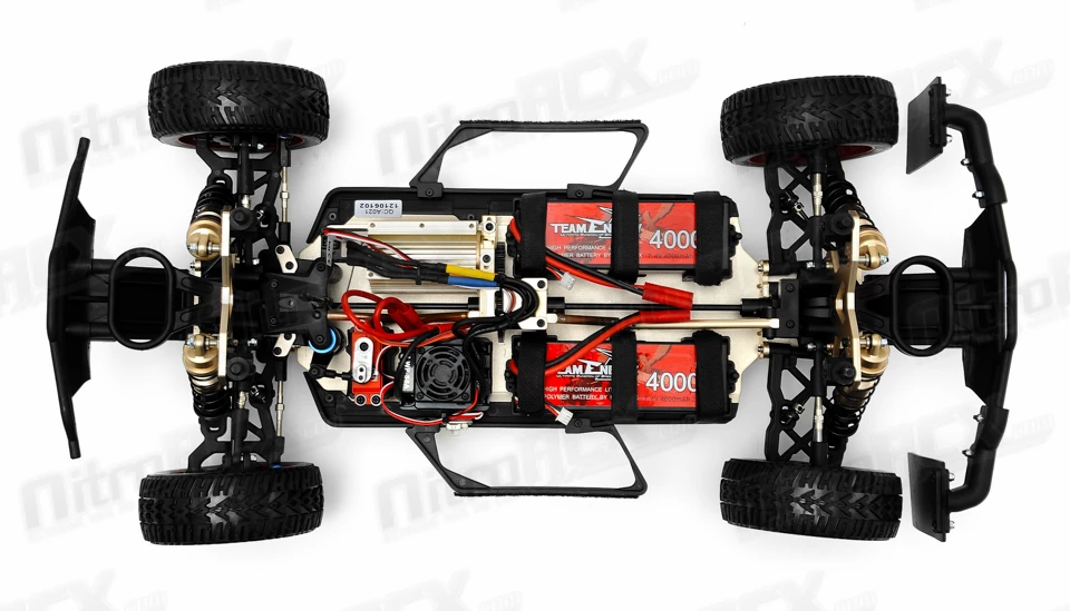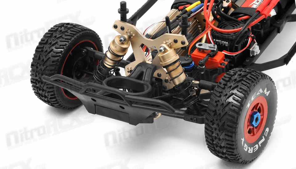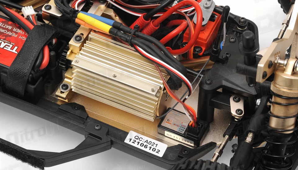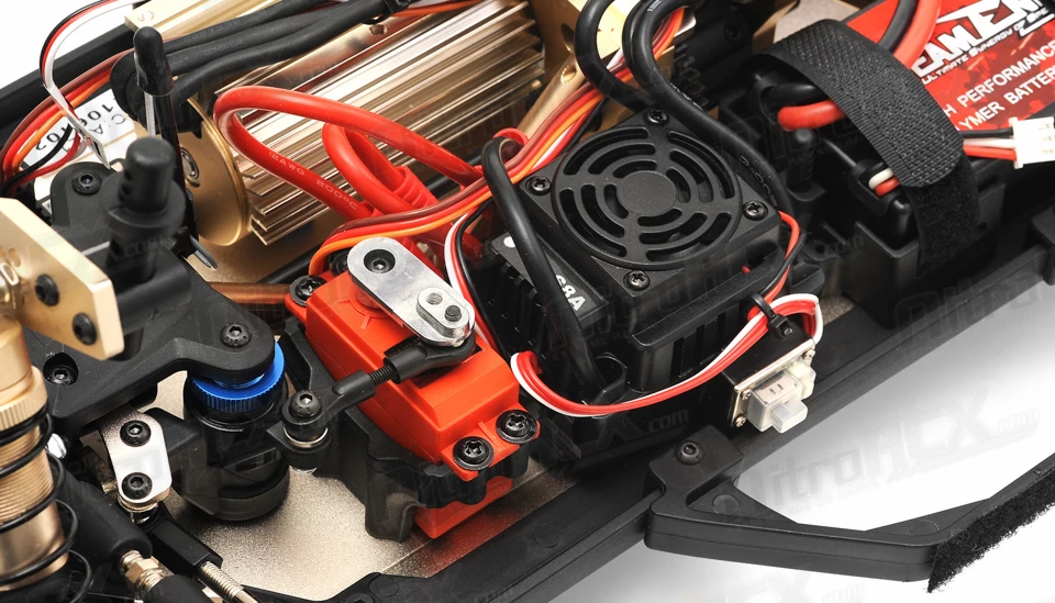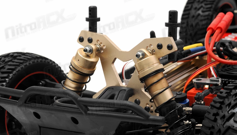 The drive train is also beefed up metal geared differentials and thick axle cups. Thick drive axles reach out to the wheel hubs with CVD joints in the front and traditional dog-bone style setup in the rear. There are no bushings on this vehicle; every rotating piece is treated with high quality sealed ball bearings for low drag and maximum rolling and rotating efficiency. Thick chassis braces mounted in strategic high leverage points ensure your hard jumps and landings do not warp or bend the chassis.