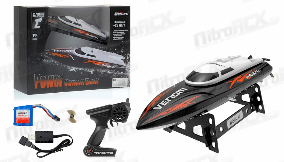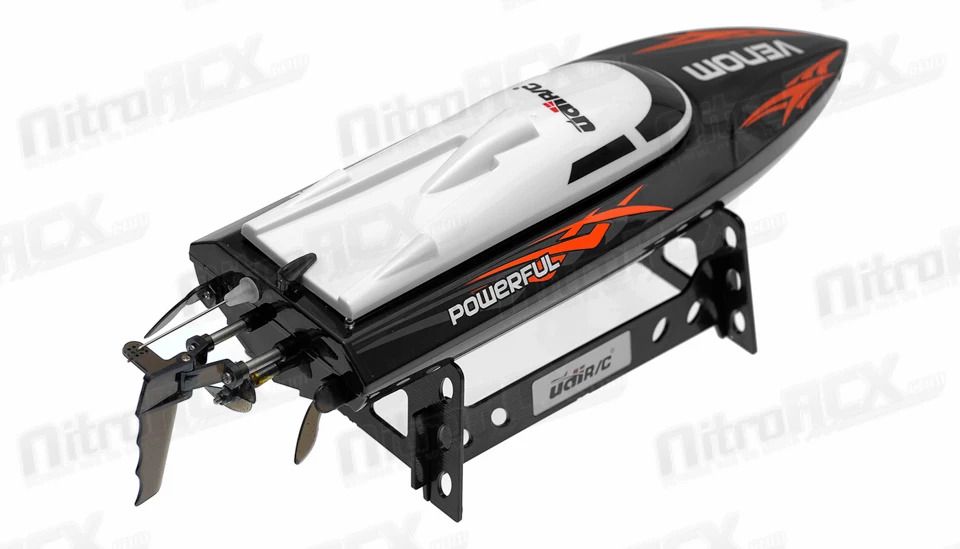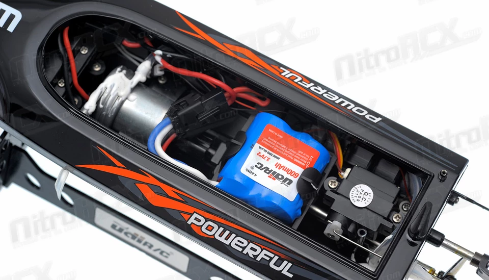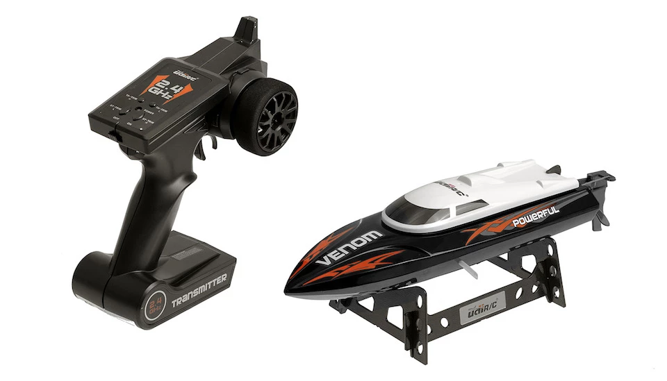 The UDI U001 comes equipped with a water cooling system to prolong the life of the boat. Advanced 2.4GHz automatic code pairing technology allows you to control different boats use different frequencies. When the 2.4G Signal becomes weak, the transmitter will detects and flashes an out-of-range light. The self-righting feature lets you command your boat back into action if it capsizes. Bilateral navigation rudder design automatically corrects yaw. When the battery runs low, the transmitter will sound “di, di, di” this warns you about 1 minute left, so you can sail it back for retrieval.